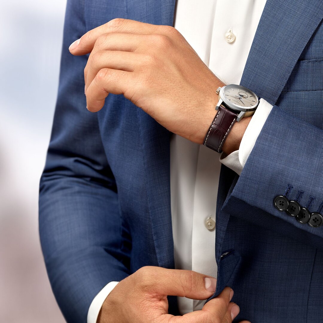 Heren horloge - leren riempje, stalen kast, saffier glas. Alle technische parameters kunnen hieronder worden gevonden