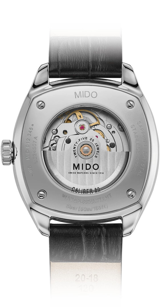 Mechanisch met automatisch opwindmechanisme. Mido Caliber 80 gebouwd op ETA C07.621 gebouwd op ETA 2836-2 gebouwd op ETA 2824-2, Lopende reserve 80h, 21.600 BPH (3Hz), 25 stenen