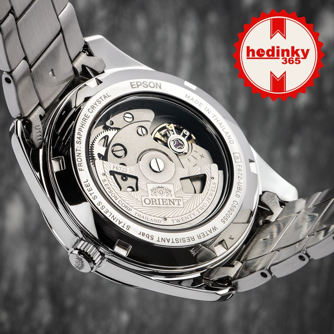 Mechanisch met automatisch opwindmechanisme. Orient F6722, Lopende reserve 40h, 21.600 BPH (3Hz), 22 stenen, Hacken, Mogelijkheid tot handmatig opwinden