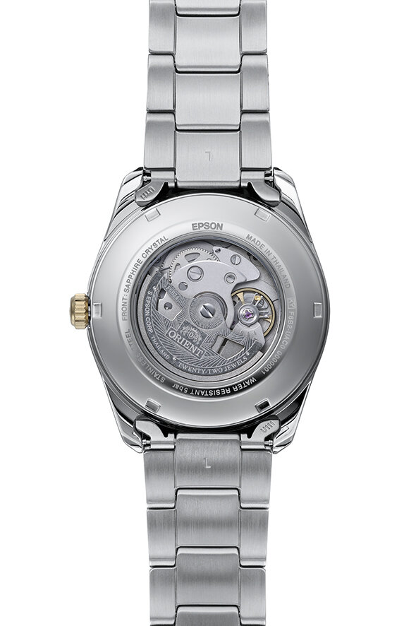 Mechanisch met automatisch opwindmechanisme. Orient F6B24, Lopende reserve 40h, 21.600 BPH (3Hz), 22 stenen, Hacken, Mogelijkheid tot handmatig opwinden, Dubbelzijdig opwinden